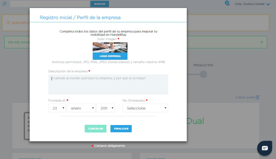 Mientras se espera la validación de la información debes finalizar el registro colocando el Logo, descripción de la empresa y llenando los datos que faltan y dando clic en FINALIZAR y después clic en PASO 2