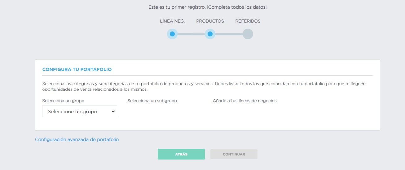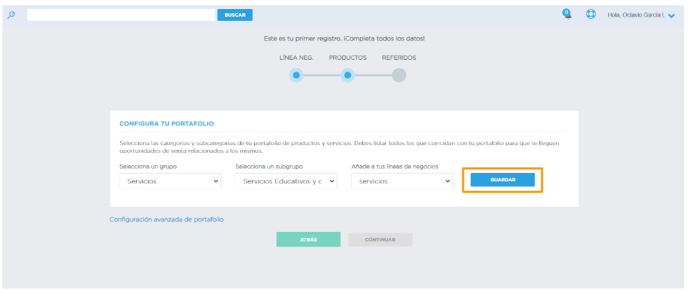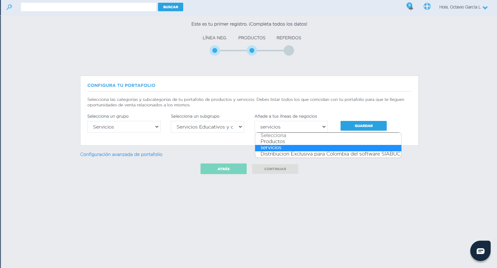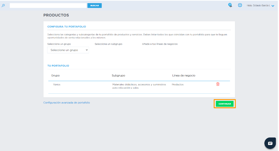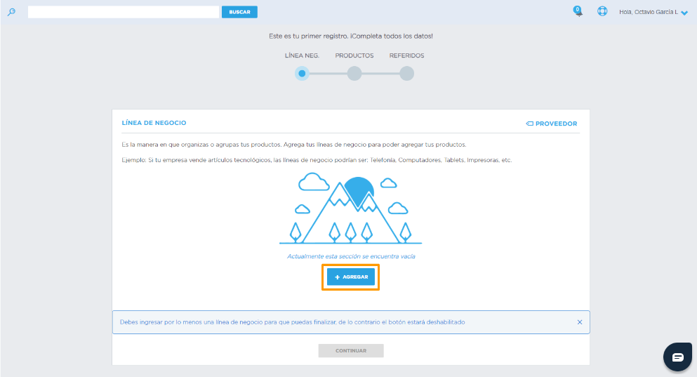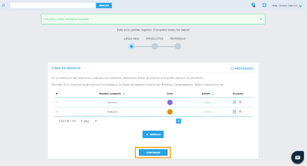Una vez creadas las lineas de negocio deseas, le das clic en la parte inferior de la pagina donde dice "Continuar"