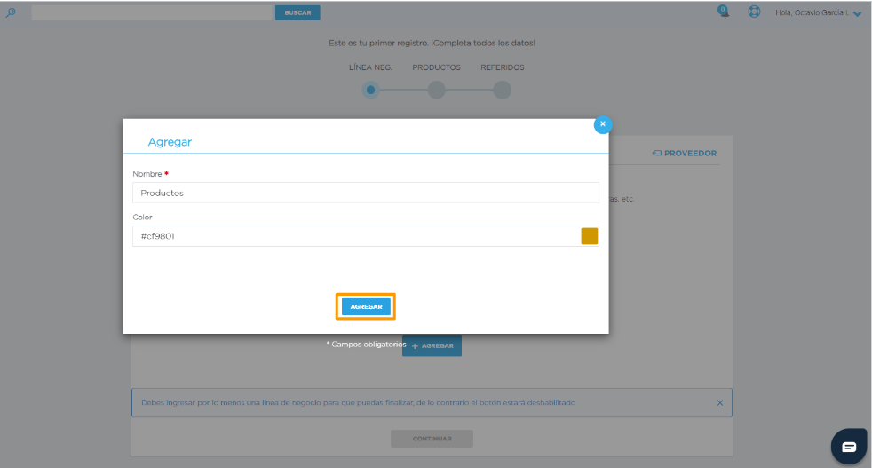 Colocas el nombre de la línea de negocio de tu empresa, si deseas un color y le das clic en Agregar
