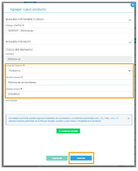 Llenamos los campos en * asteriscos y si deseas los opcionales tambien, puedes adjuntar imagen del producto y clic en el botón azul "ACEPTAR" para guardar ese producto en el portafolio