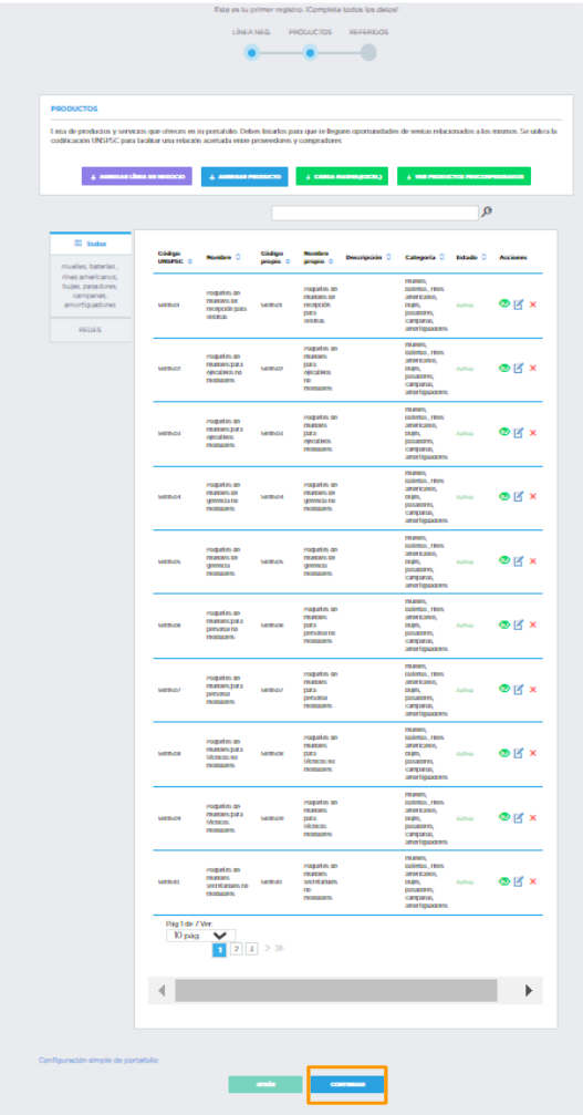 Ya una vez tengas las líneas y productos deseados, agregados en la parte inferior de la página se encuentra en botón de CONTINUAR, le das clic alli y listo, has finalizado el registro completo de tu empresa en HandelBay